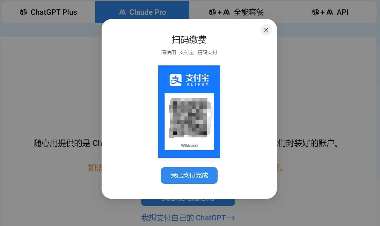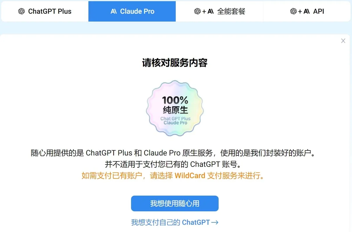 🔔 如果点击【我想支付自己的ChatGPT】会跳转到开通【野卡支付会员】,那是虚拟卡服务。