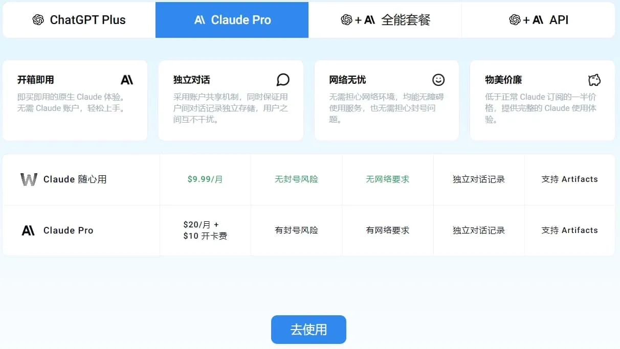 点击【Claude Pro】即可了解详细内容,主要是使用原生Claude官网账号,无封号风险,无网络要求,独立对话开箱即用。