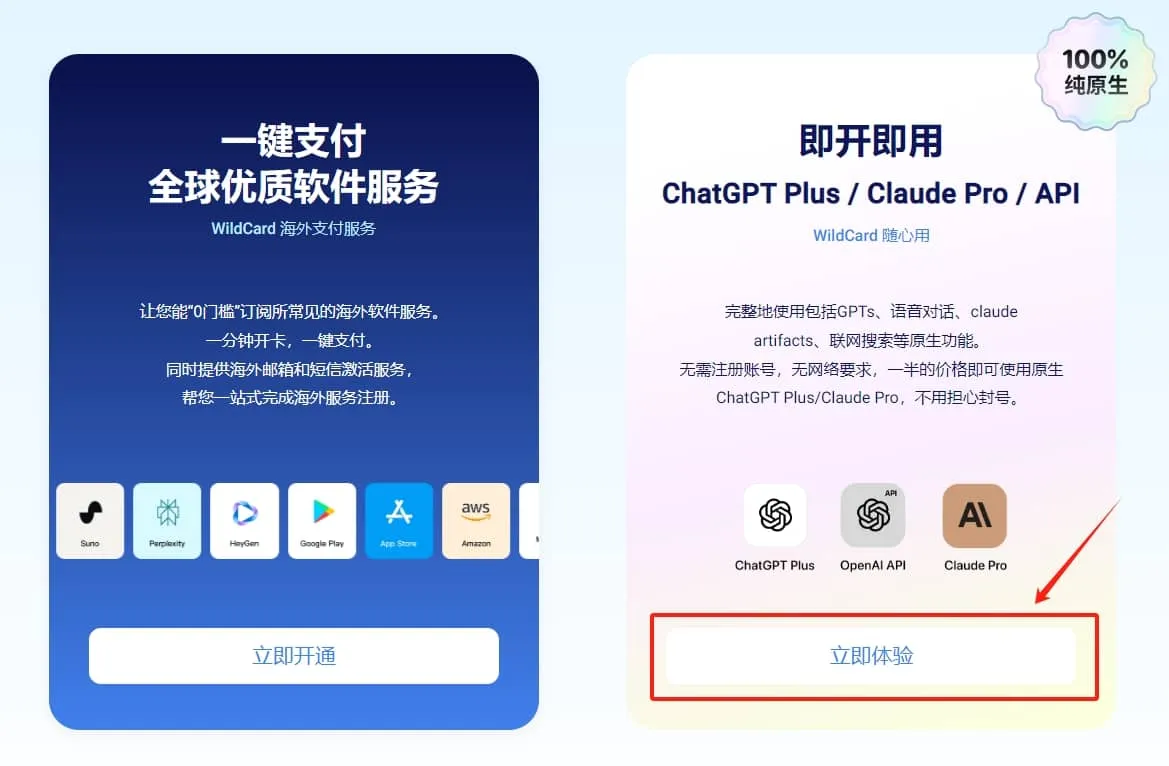 💡 左侧是【野卡支付会员】的虚拟卡服务,主要用于解决国内信用卡无法订阅海外软件服务的问题。如果你需要订阅ChatGPT官网的Plus会员或Claude官网的Pro会员,可以选择开通野卡支付会员。