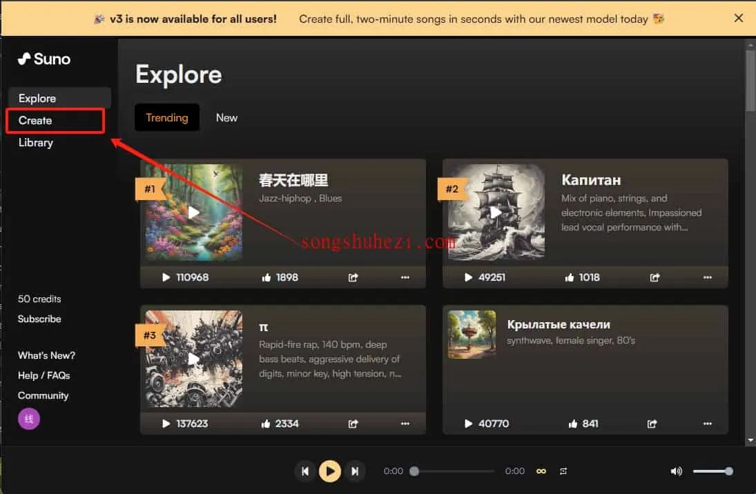 首先,访问 Suno 的 官方主页。登录后,寻找并点击 Create 按钮,这将带你进入一个全新的音乐创作界面。在这里,每个人都可以成为音乐家。