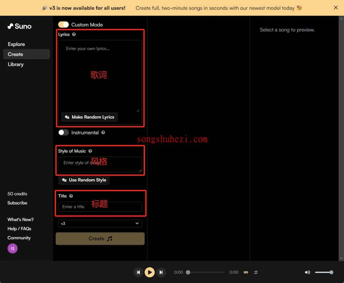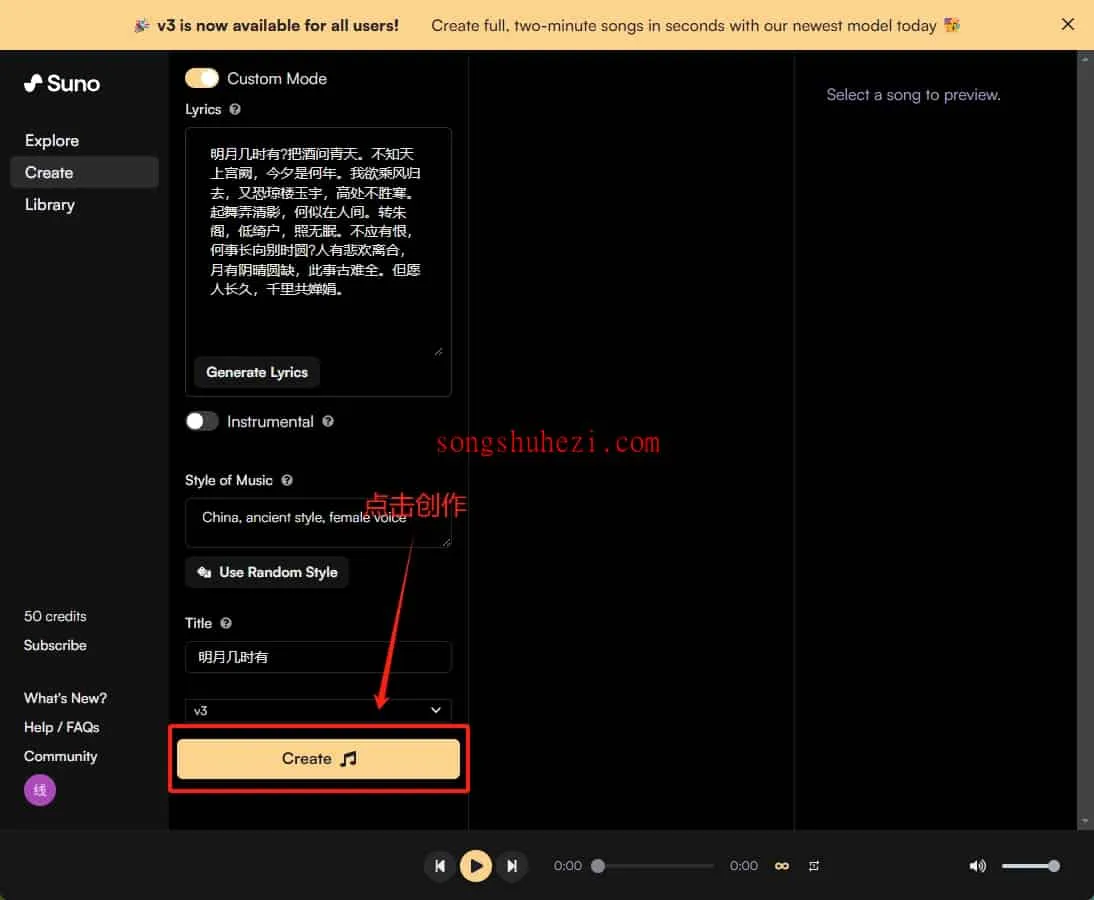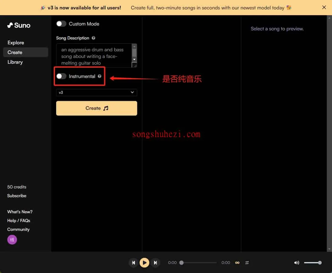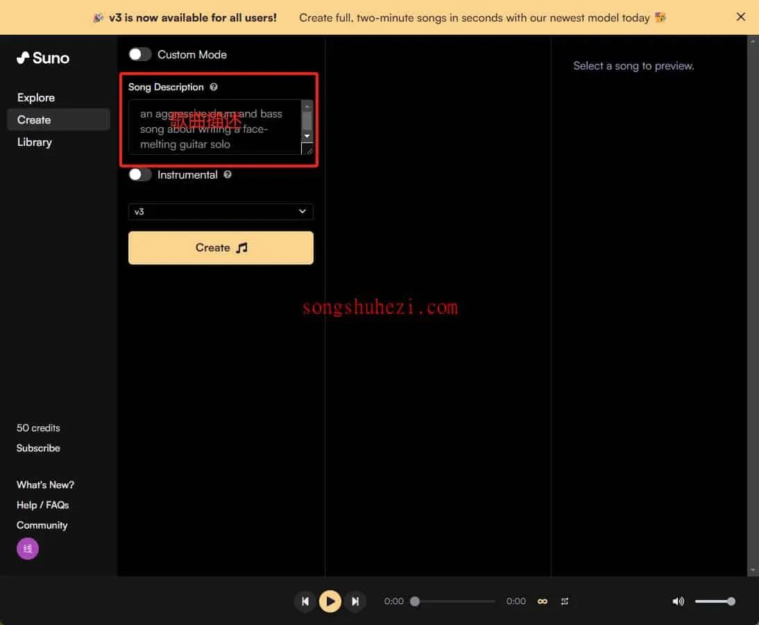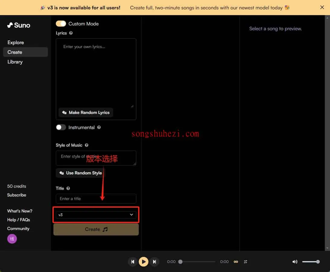 虽然 Suno 提供多个版本选项,但对于初次尝试的你,推荐选择默认的 V3 版本,它足以满足大多数音乐创作的需求。