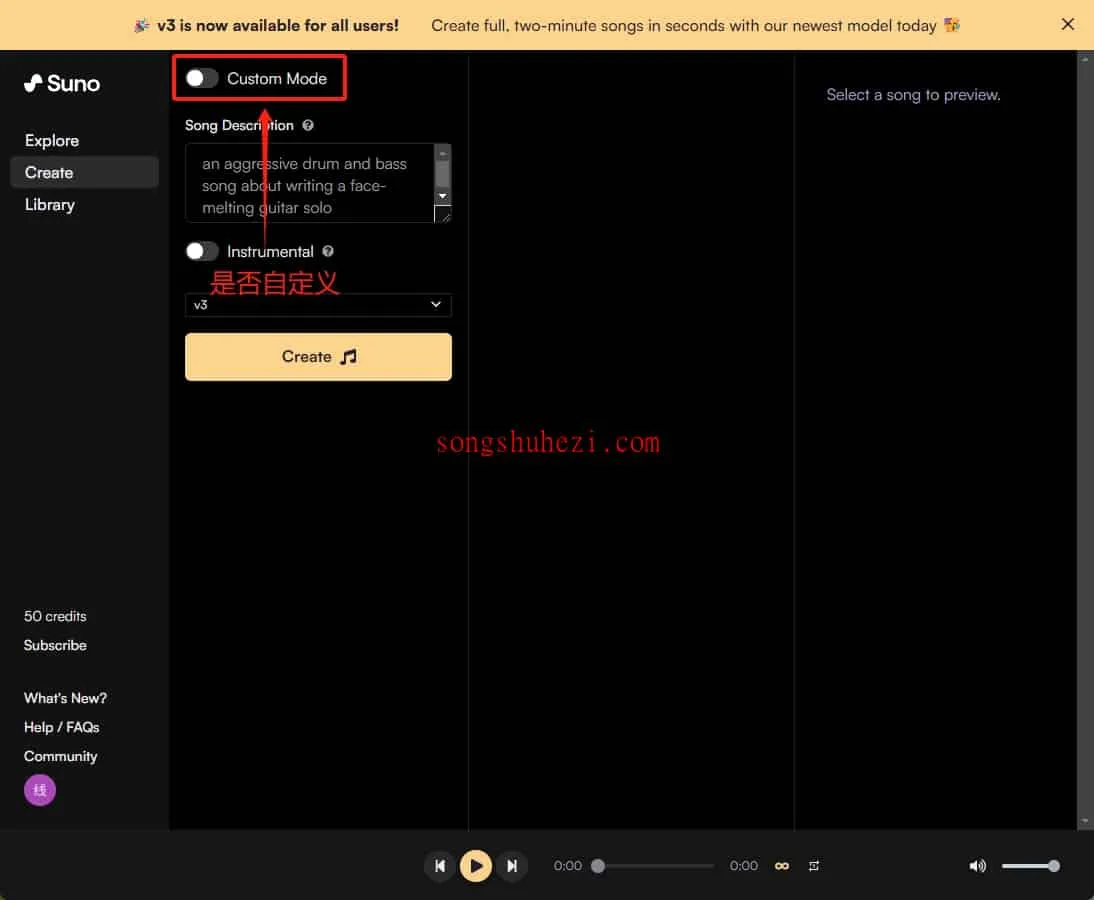 进入歌曲创建界面后,你会注意到 Custom Mode(自定义模式) 选项默认是关闭的。要开始你的音乐创作,首先需要开启这一模式。