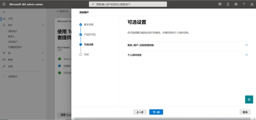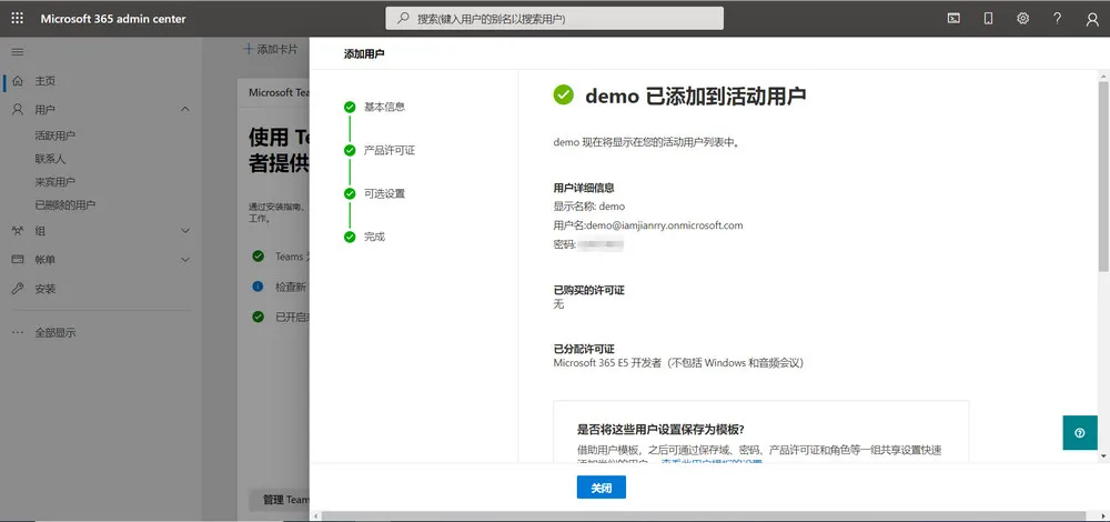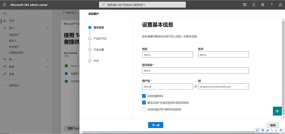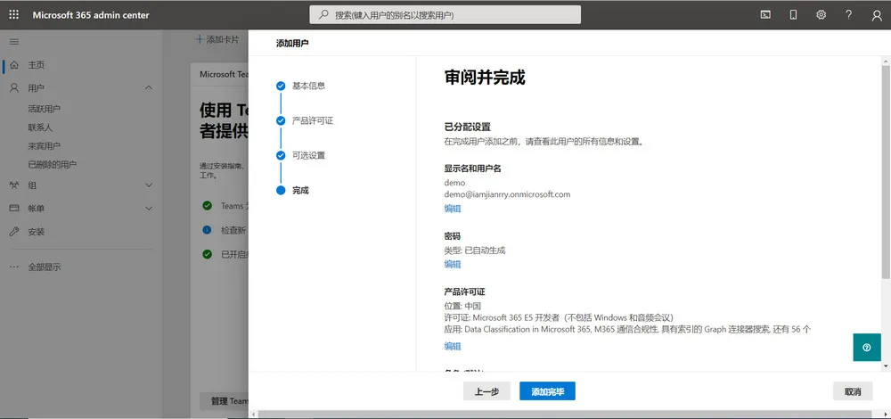 点击”添加用户”,注册一个 Microsoft 365 E5 的子账号。