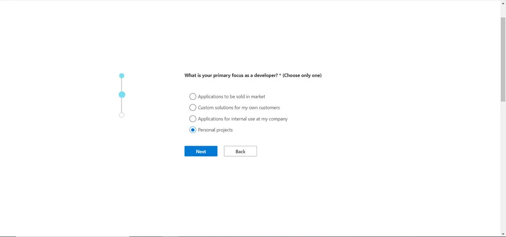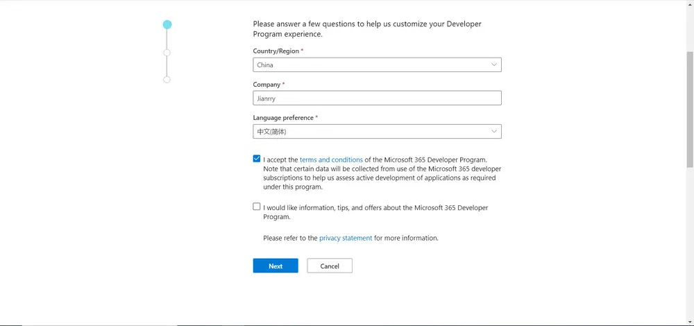 依次填写你的个人信息,注册 Microsoft 开发者账号。
