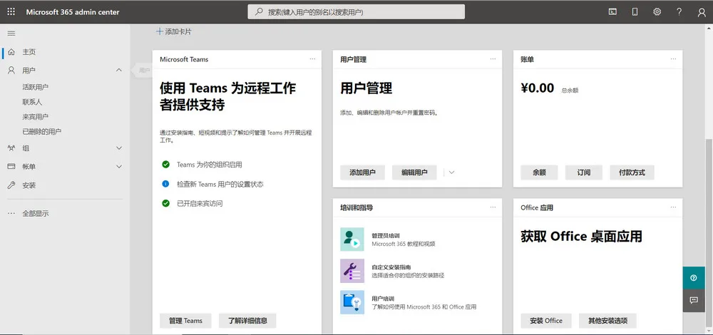 打开 Microsoft 365 管理员中心,登录你的 Microsoft 365 E5 管理员账号。