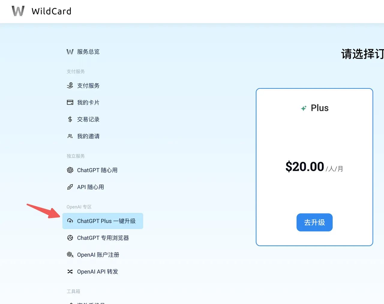 - 使用 野卡 一键升级 ChatGPT Plus:登录 野卡,点击一键升级。