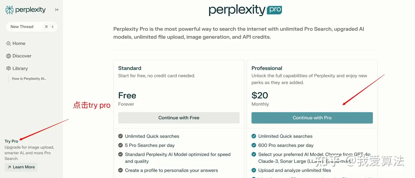 - 进入 Perplexity 官网,点击 “Try Pro” 后选择你想要升级的服务。