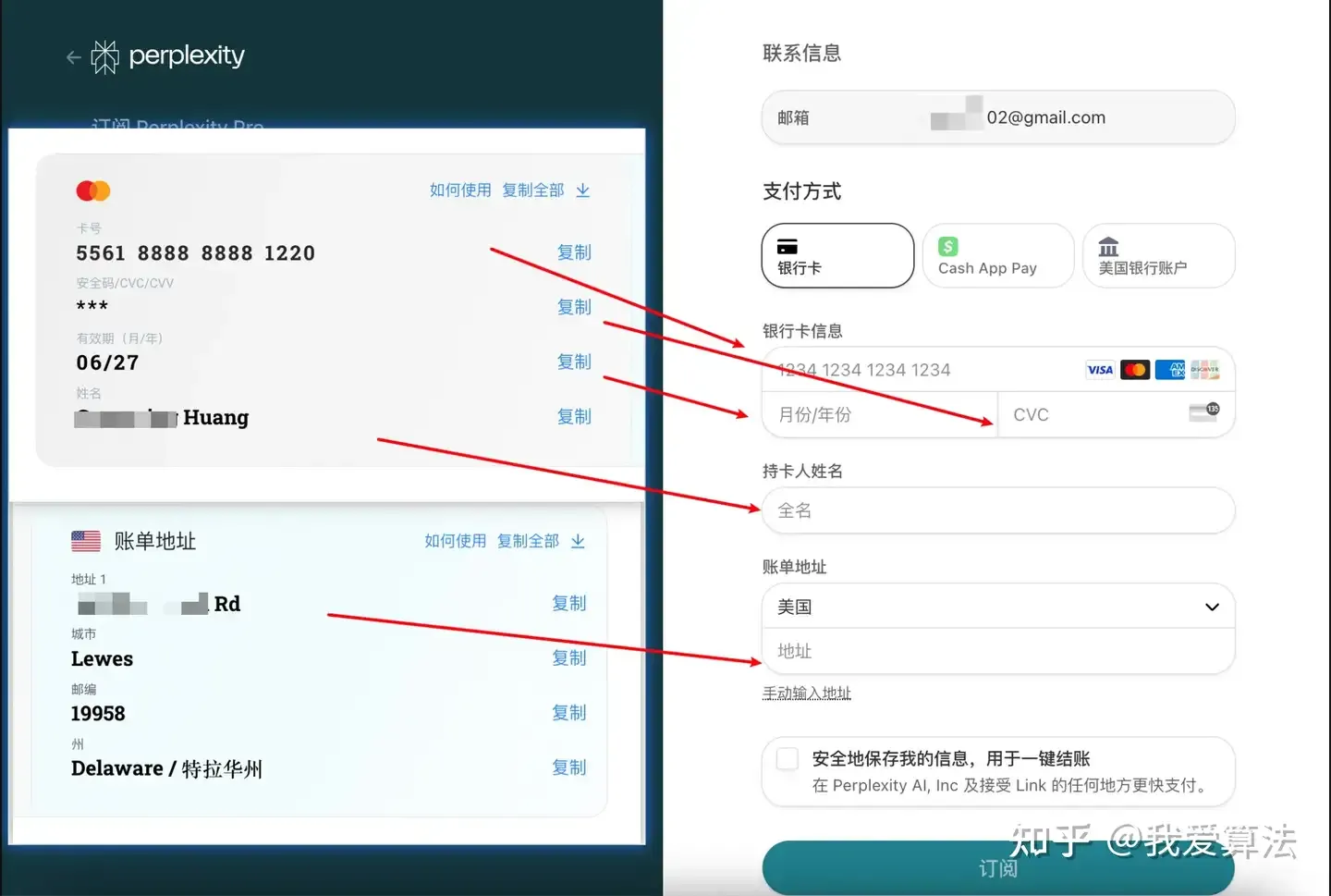 - 将卡片信息填入 Perplexity 绑卡页面。记得确保账户余额充足!建议账户有至少 21 美元,以确保绑卡成功。