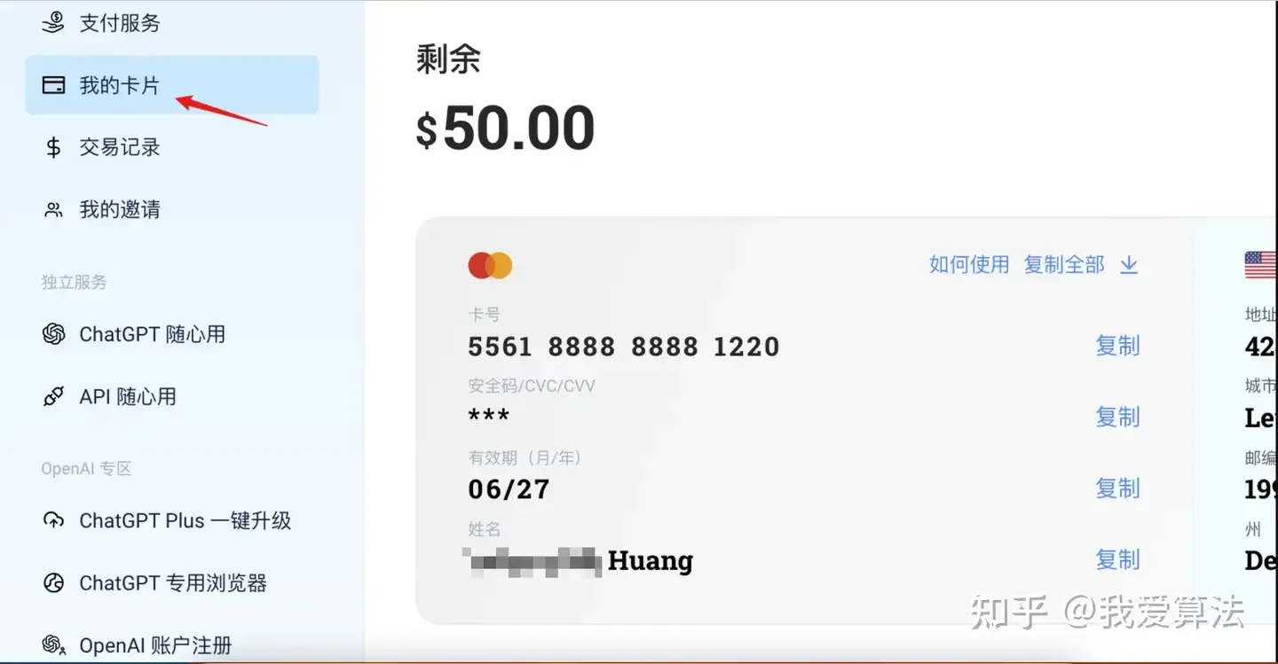 - 进入虚拟卡平台,点击 “我的卡片”,获取所需的卡片信息。