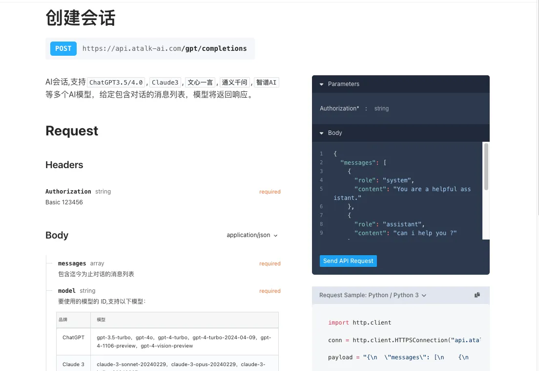 通过一个接口即可对接国际主流 AI 模型,兼容性方面我们已经为大家处理好了,您只需无脑对接即可。API 文档地址:api.atalk-ai.com/api#/operations/post-gpt-completions-messages
