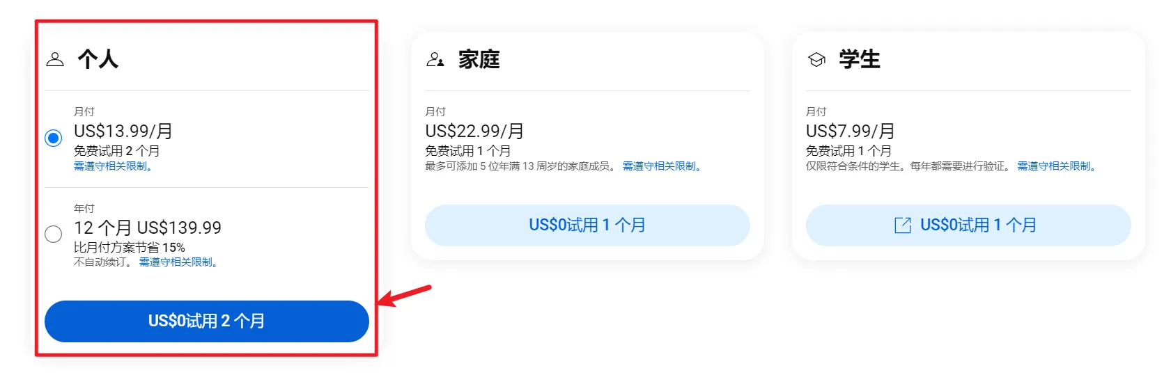 - 稳定的 IP 地址:需要使用除中国地区之外的 IP,本教程以美国为例,但各国的订阅价格可能有所不同,用户可根据实际需求选择。
