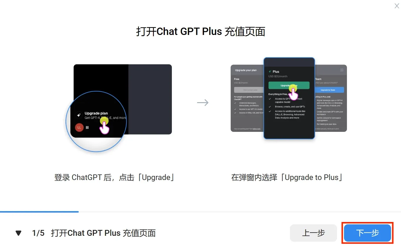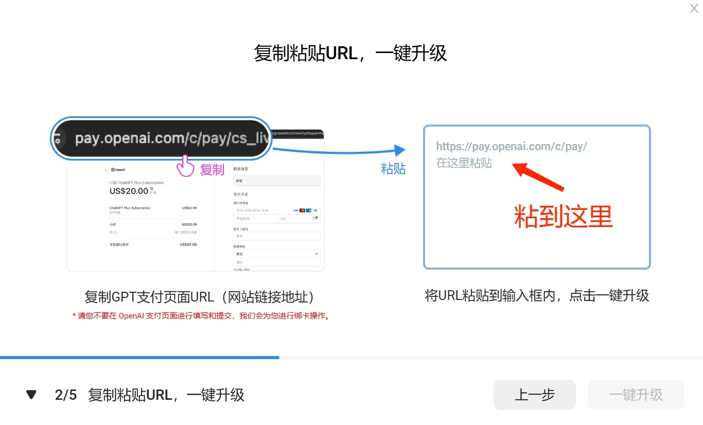 接着点击下一步,按照提示将 GPT 升级链接复制到输入框中,再点击确定支付以开通 GPT-4。