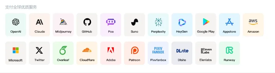 这张卡不仅可以用于升级 ChatGPT,还可以订阅许多常见的国外软件,如 Claude Pro、OnlyFans、Midjourney、SUNO、Google Pay、Cursor 等等,强烈推荐开一张。