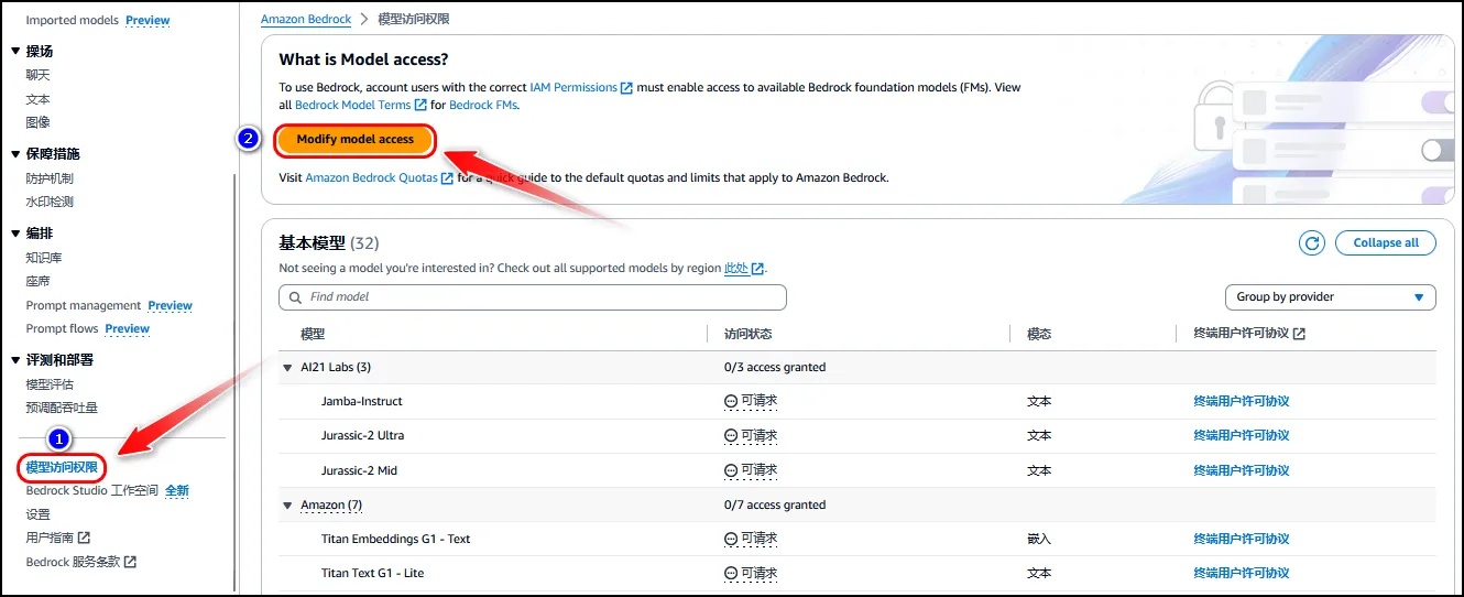 访问Amazon Bedrock控制台,依次选择模型访问权限 -> Modify model access。