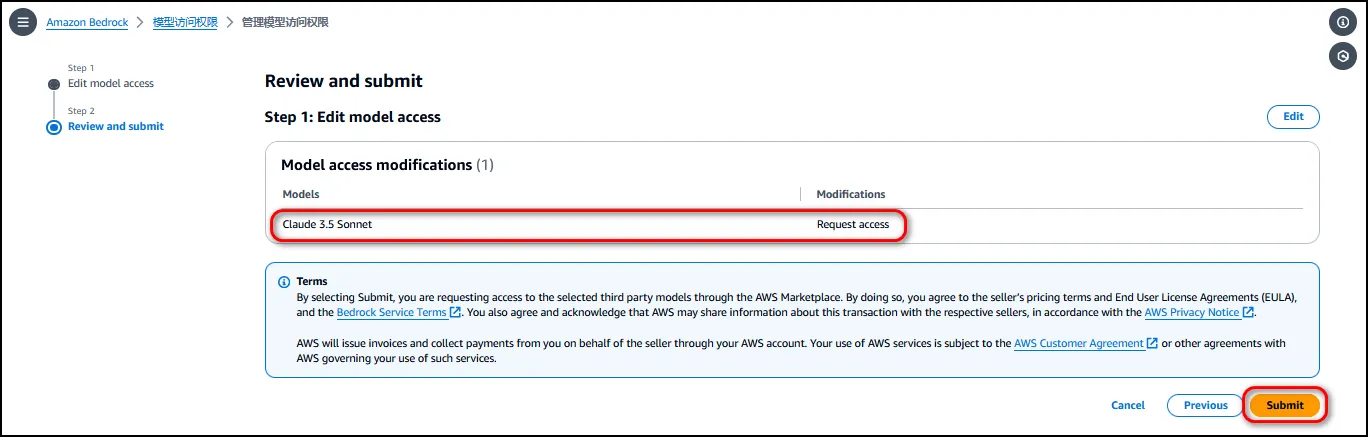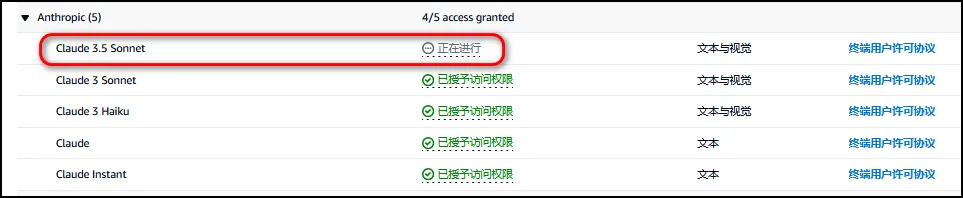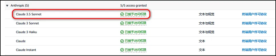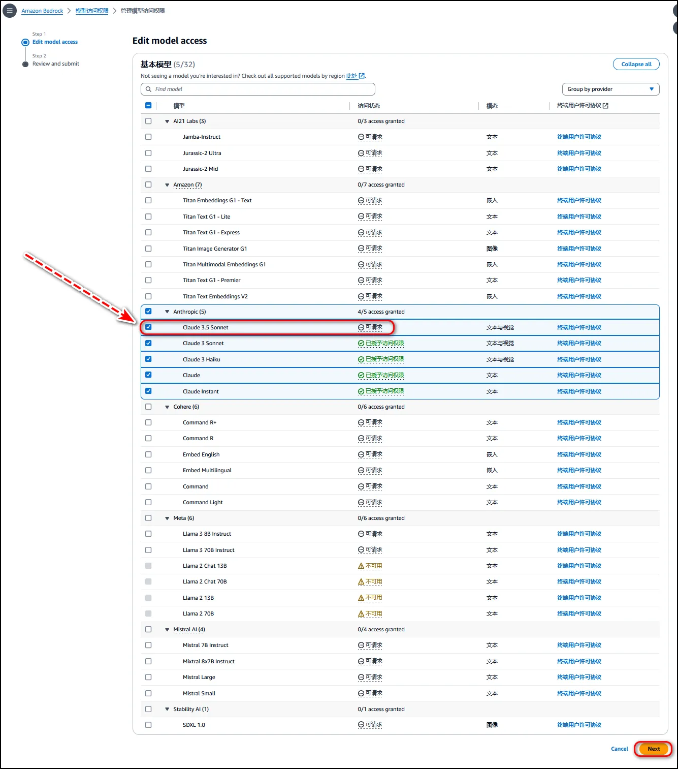 编辑模型访问设置,勾选需要授权访问的Claude 3.5 Sonnet模型。
