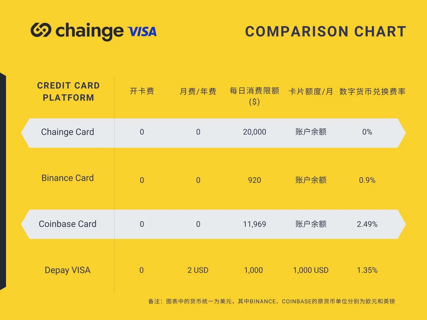 以下是Chainge Card、Binance Card、Coinbase Card、Depay VISA这四个市场上加密虚拟卡的横向对比。