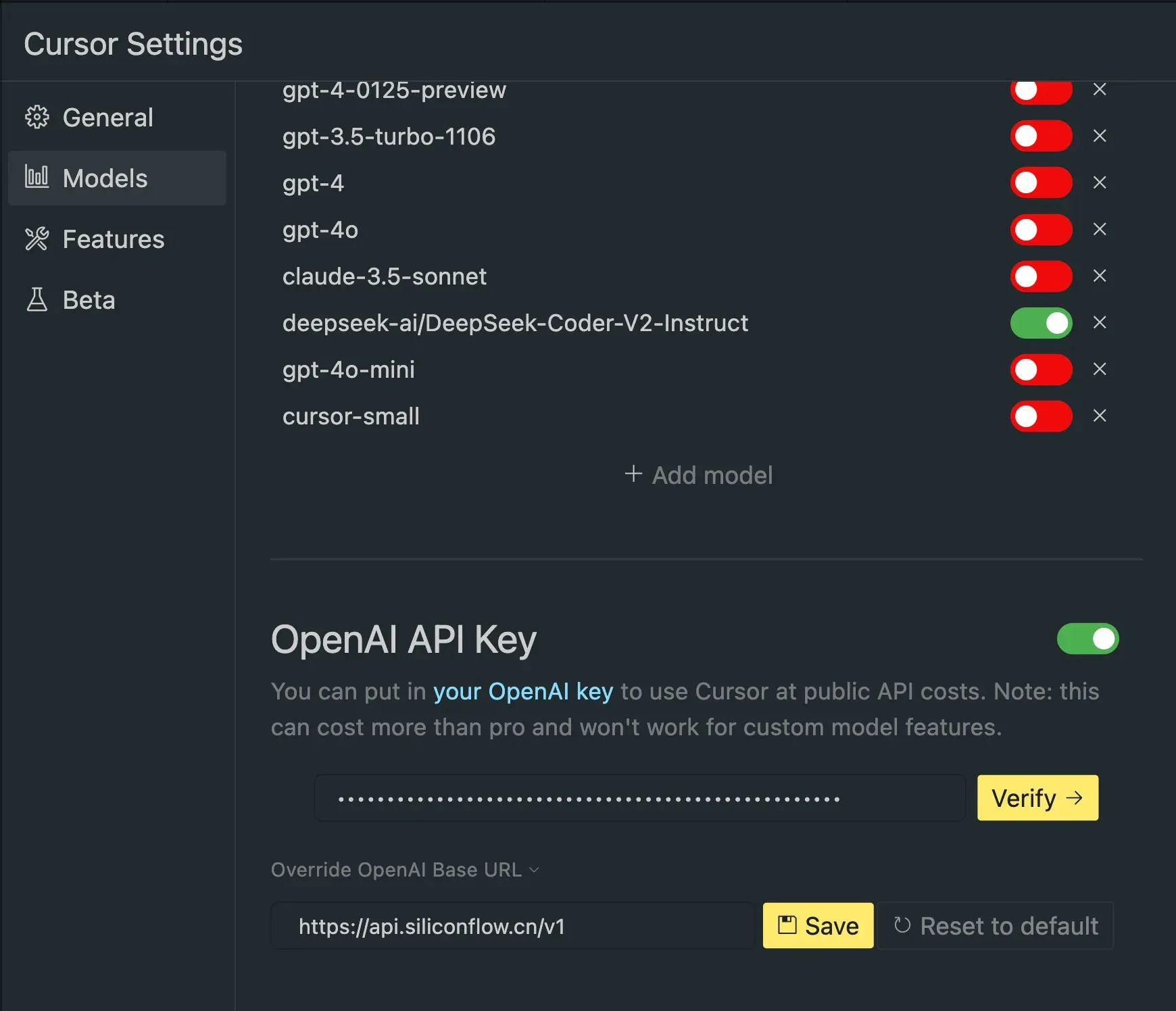deepseek-coder。 - 在 OpenAI API 的设置中输入 DeepSeek 的 API 密钥。