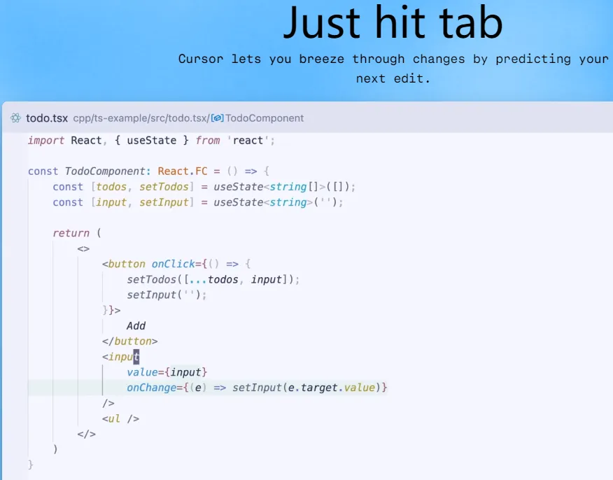 - Tab:自动填充代码。当 Cursor 提供代码补全建议时,使用 Tab 键接受即可。