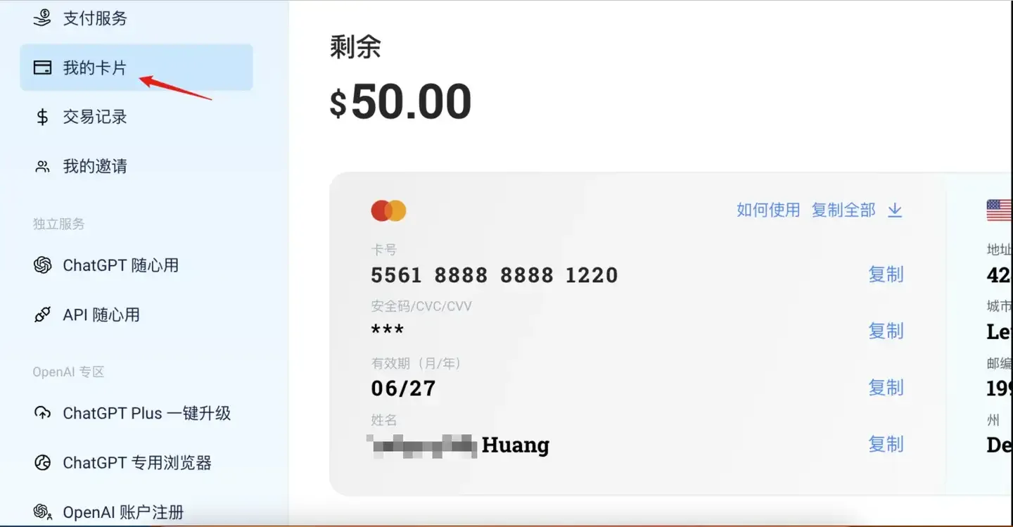- 请确保在 OpenAI 绑卡前,卡上至少有 5 美元的余额,否则会导致绑卡失败。