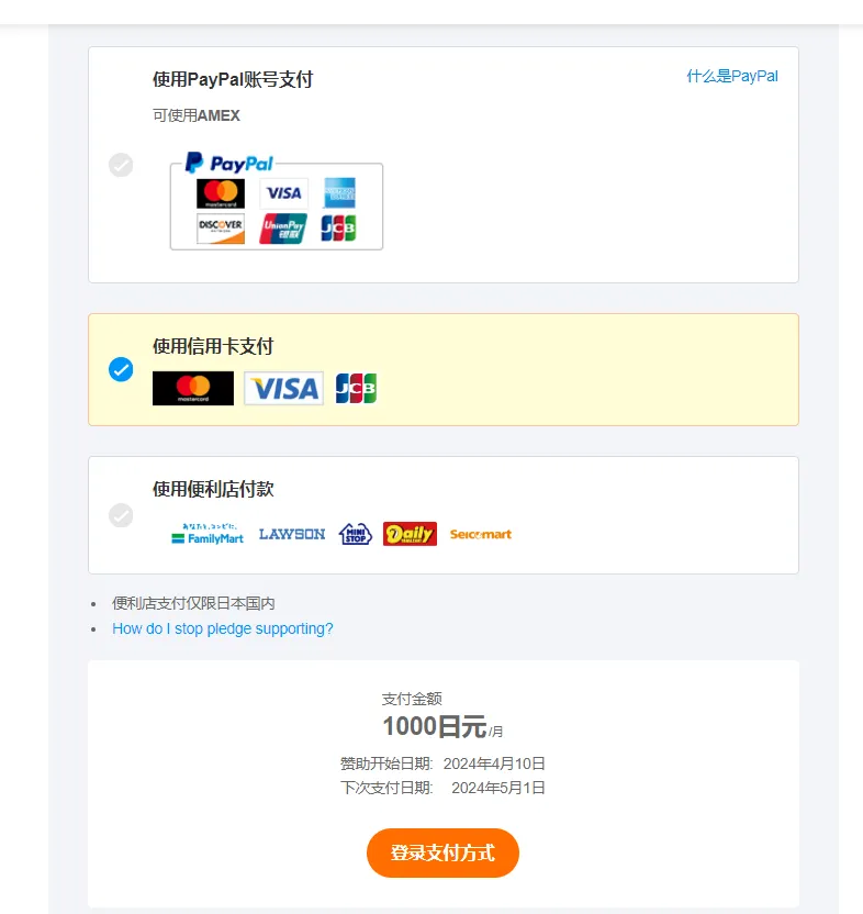 在支付方式界面选择“使用信用卡支付”,然后点击“登录支付方式”。
