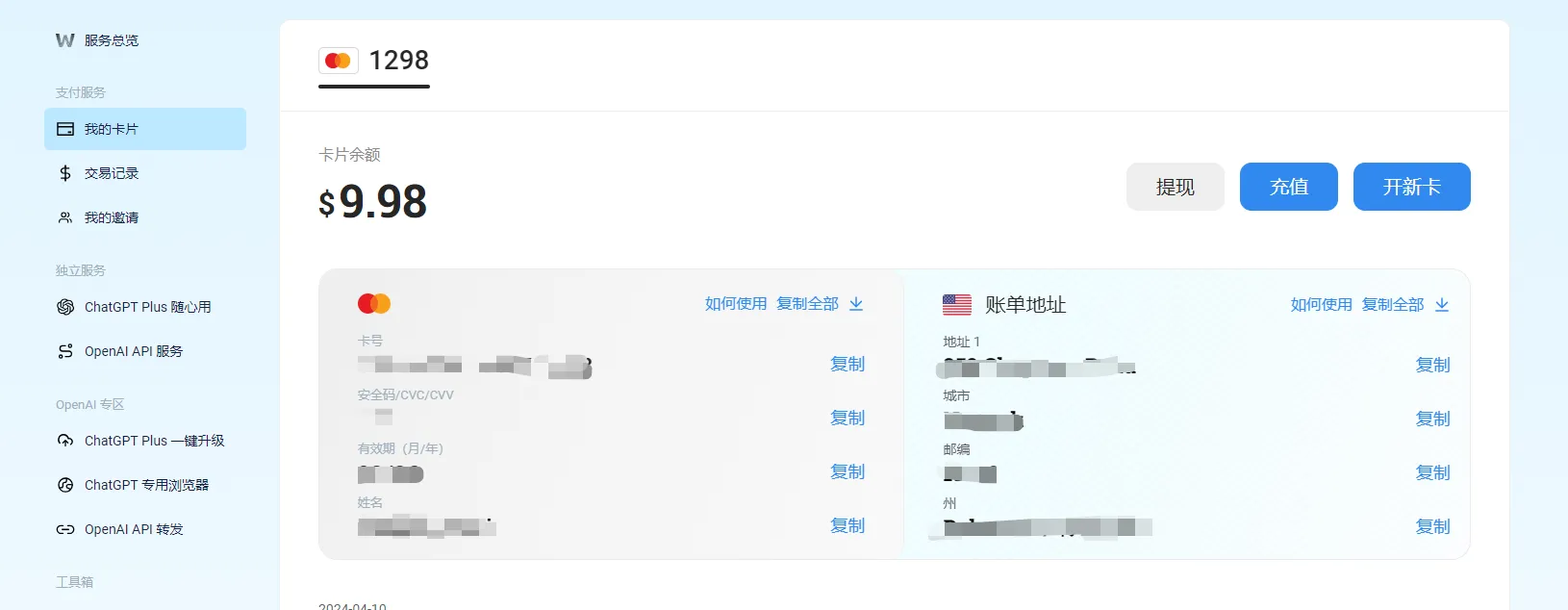 野卡 虚拟信用卡(申请需要一定的开卡费用,使用以下链接开卡可以省一杯奶茶钱)支持包括 ChatGPT、OnlyFans 和 PixivFANBOX 等在内的一众海外服务,跟随官方指引注册开卡即可。
