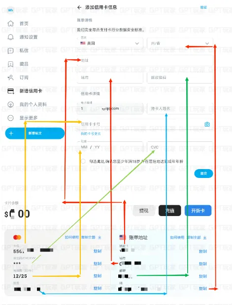 将 野卡 中的银行卡信息和账单信息填写到OnlyFans平台上,信息对应关系请参考下图。