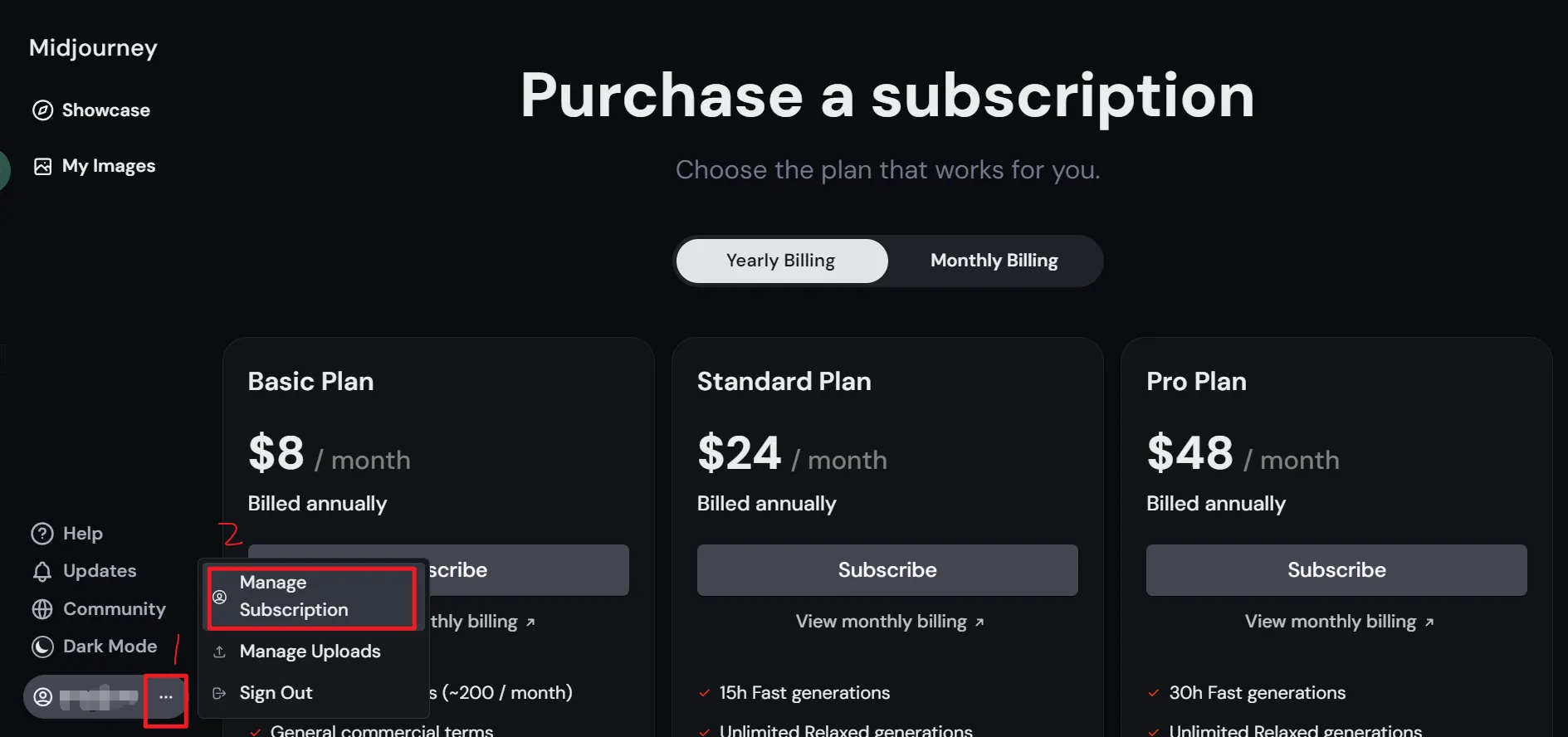 - 登录后,点击左下角的【…】号,再选择【Manage Subscription】,即可选择套餐进行订阅。