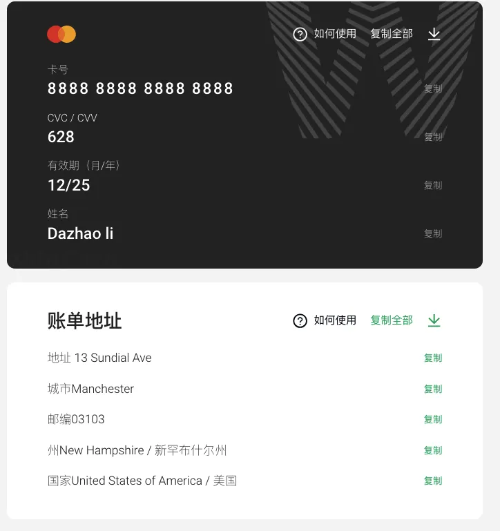 您可以直接从虚拟卡网页上获取所需的所有信息,如卡号、有效期、安全码等,然后复制粘贴到OnlyFans的相应支付信息栏中。