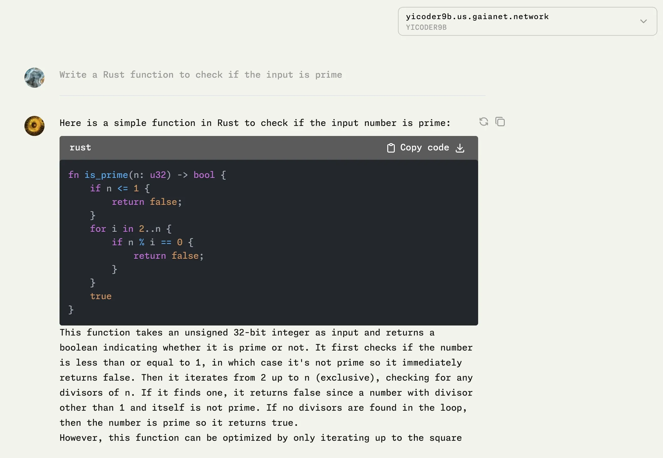 您将获得一个 HTTPS URL,格式为 https://NODE-ID.us.gaianet.network。同时,您可以在浏览器中访问 http://localhost:8080 来提问编程相关问题。