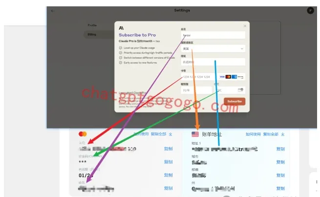 - 将注册得到的 野卡 虚拟银行卡信息复制到 Claude 页面中,完成支付充值。