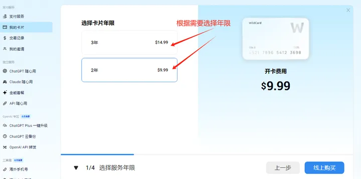 5. 选择卡片使用期限,并扫码支付虚拟信用卡年费。