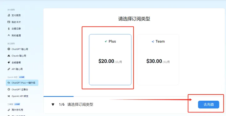 因为ChatGPT Plus的订阅费用为每月20美金,因此你的充值金额必须大于等于20美金。