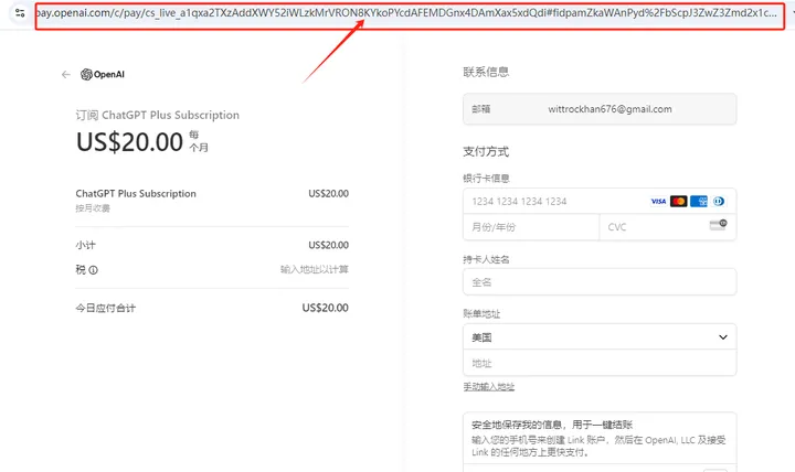 提示:进入到ChatGPT Plus订阅费用支付页面后,无需填写任何信息,直接复制完整网址即可。