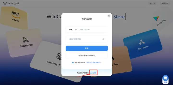 - 使用+86手机号完成野卡账号注册。