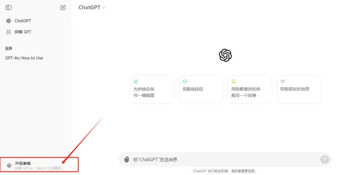 11. 在浏览器新窗口中登录你的ChatGPT账号,并点击左下角的“升级套餐”。