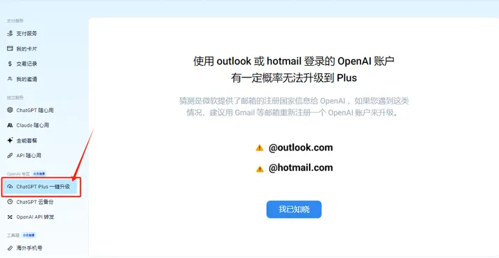 9. 点击左侧导航栏中的“ChatGPT Plus一键升级”按钮。