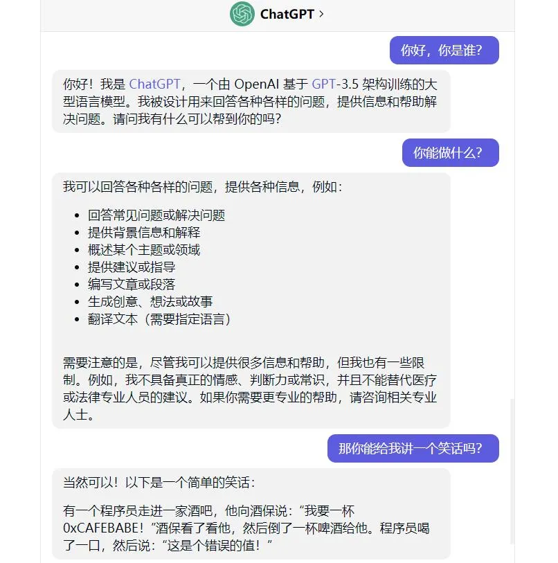 ChatGPT:你好,我是 ChatGPT,一个基于 GPT 系列的对话 AI,很高兴认识你。