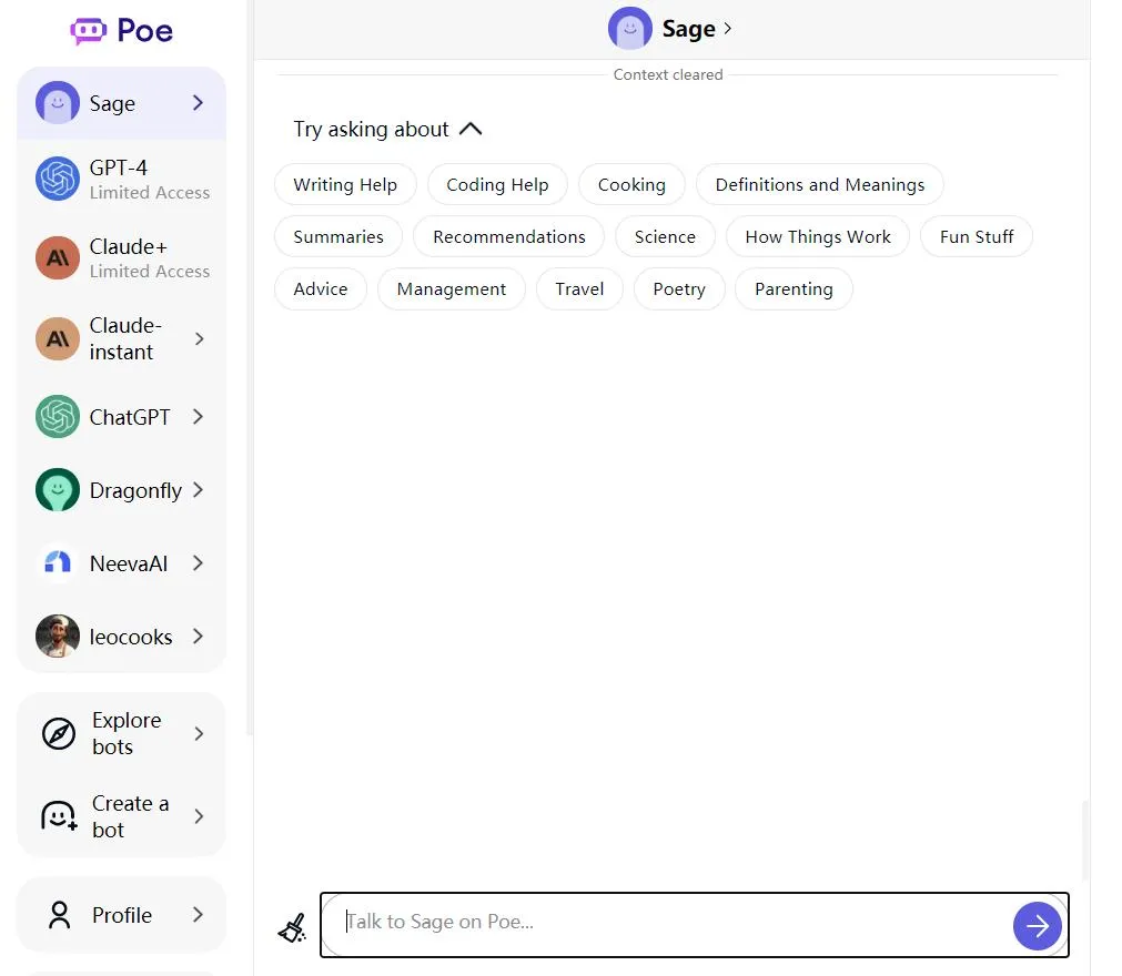 Poe 平台集成了多个基于大型语言模型的聊天机器人,包括 ChatGPT、Sage、Claude 和 Dragonfly。每种机器人都有其独特的特点和优势。
