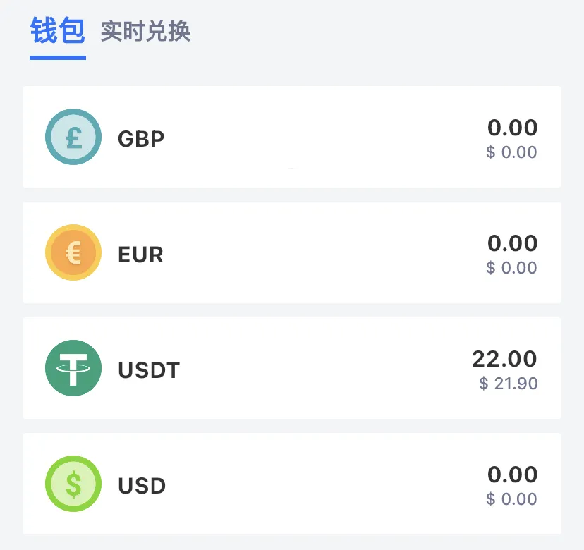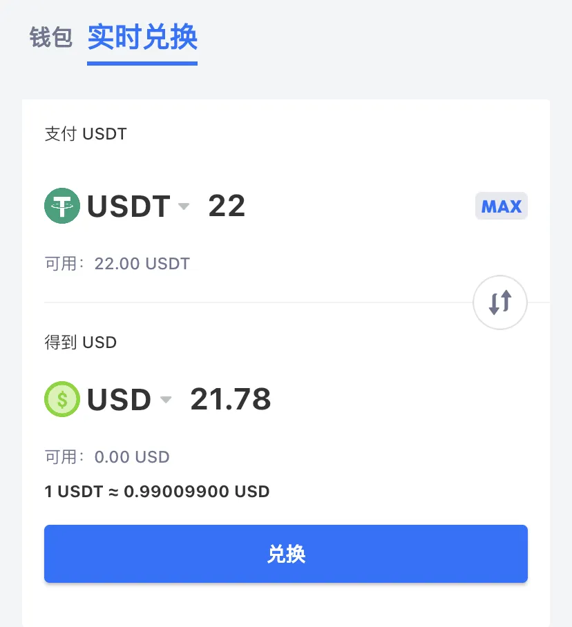 充值后需将 USDT 兑换为 USD,钱包中点击即可实时兑换。