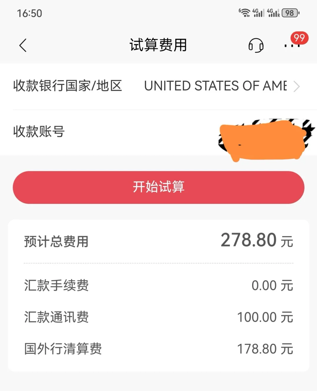 当然,别觉得太贵,如果是正常的小额海外汇款,手续费就更“离谱”了!以我向招商银行美国账户转100美元为例,总成本约为278元,损失高达39%。这意味着,如果你想给在美国的朋友汇100美元,实际上你需要支付178元的手续费,朋友最终只能收到61美元左右。这简直是“肉包子打狗,有去无回”啊!