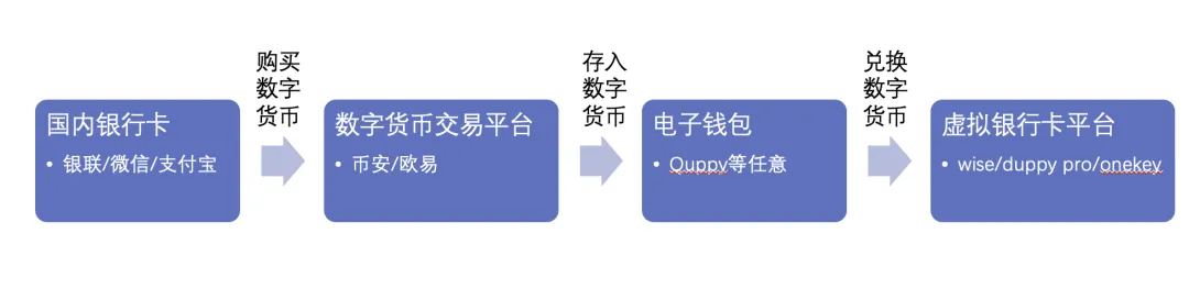 以Wise为例,虽然不支持数字货币交易,但可以通过其他电子钱包进行转账,完成资金充值,完整的资金流向如下: