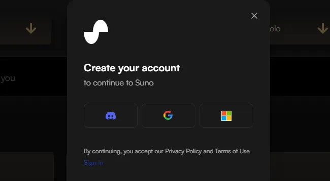 前往 Suno AI 网站并创建一个免费账户。这样您就可以访问该平台强大的音乐生成功能。请注意,Suno 只支持 Discord、Google 以及 Microsoft 账号,创建账户前请确认拥有这三个平台账号中的一个。