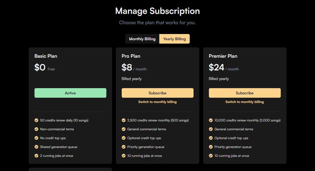 Suno AI 提供免费版本,允许用户每天创作最多 10 首歌曲。对于追求更高创作自由度和产量的用户,平台还提供经济实惠的订阅选项。