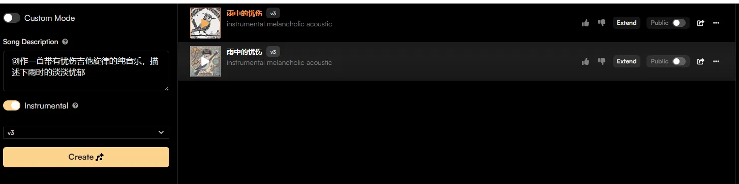 输入文本提示后,单击“Create”按钮,Suno 将根据您的输入快速创作出独特的音乐作品。
