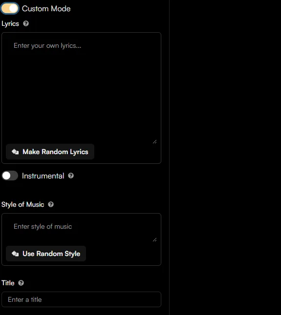 在 简易模式 下,系统会根据输入的提示词选择音乐风格并自动生成歌词。在文本输入字段中,您可以提供希望 AI 生成的歌曲的详细描述,或者输入自己的自定义歌词。输入越具体、描述越详细,生成的歌曲就越有针对性。Instrumental 控制是否需要歌词。
