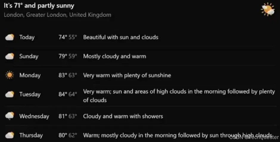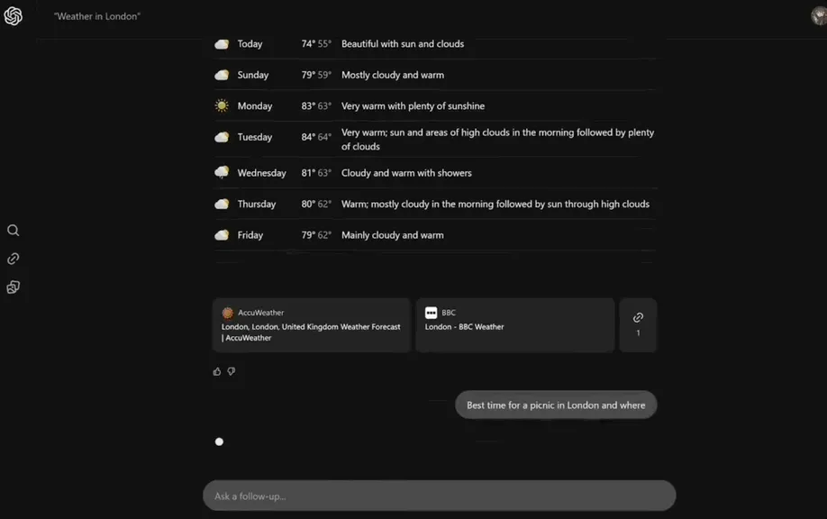 例如,当博主询问伦敦的天气时,SearchGPT直接提供了一个列表,清晰地展示了未来一周的天气情况。接着,博主继续提问伦敦最适合野餐的地方以及最佳时间,SearchGPT迅速列举了许多公园,并配有照片,建议工作日去避免人多拥挤。