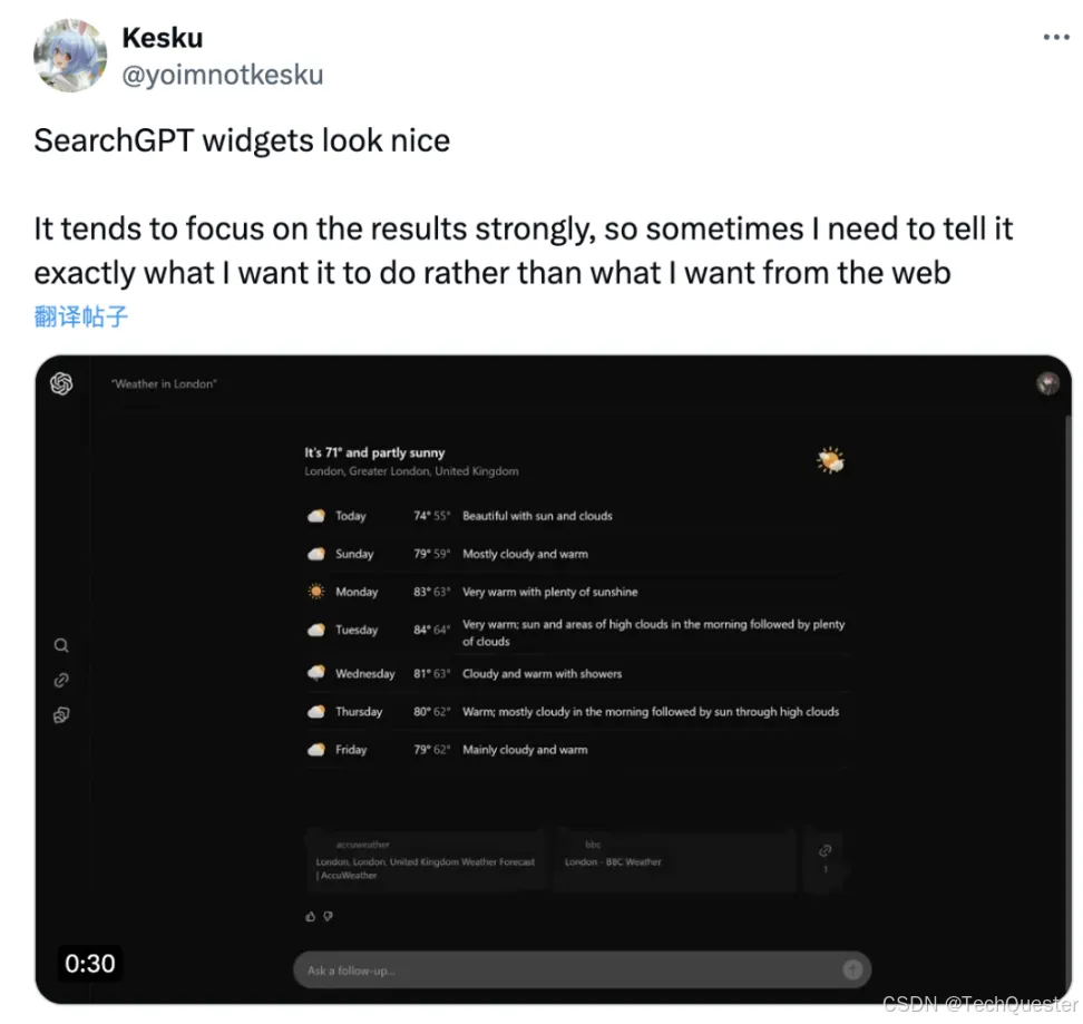 根据测试者的反馈,SearchGPT的响应速度和输出速度都非常快。 有用户表示,其速度快得令人难以置信,并希望在开放使用后依然能保持这种速度。言下之意是,目前的高速度可能是由于使用人数较少。