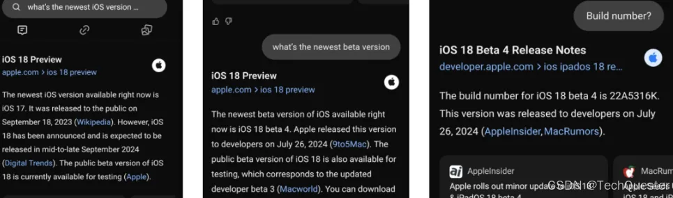 博主还为评论区的网友简单测试了一下,询问SearchGPT苹果iOS的最新版本。结果中首先用大字展示了结论——iOS18预览版,然后详细说明了最新的正式版是17,同时18也开始测试了。