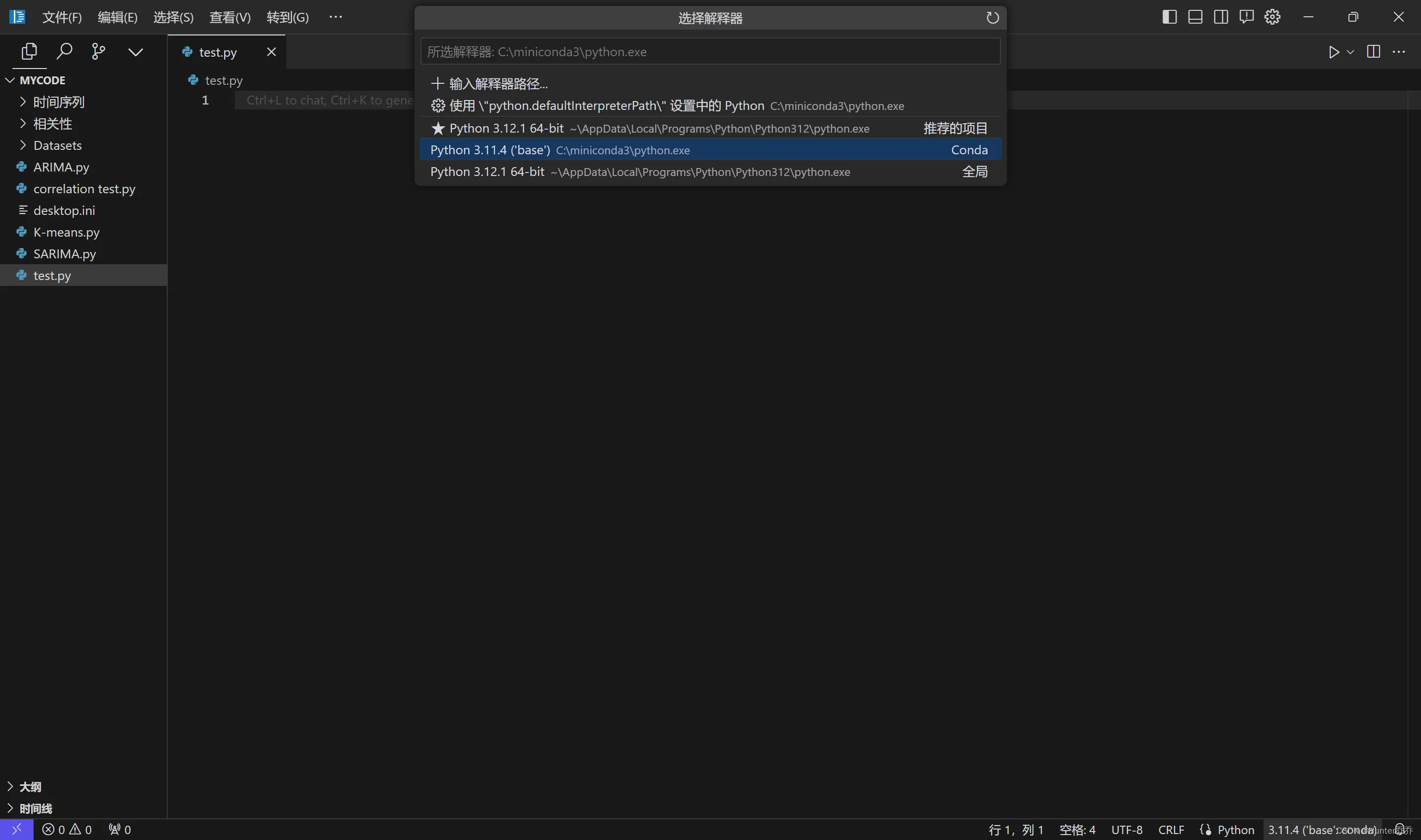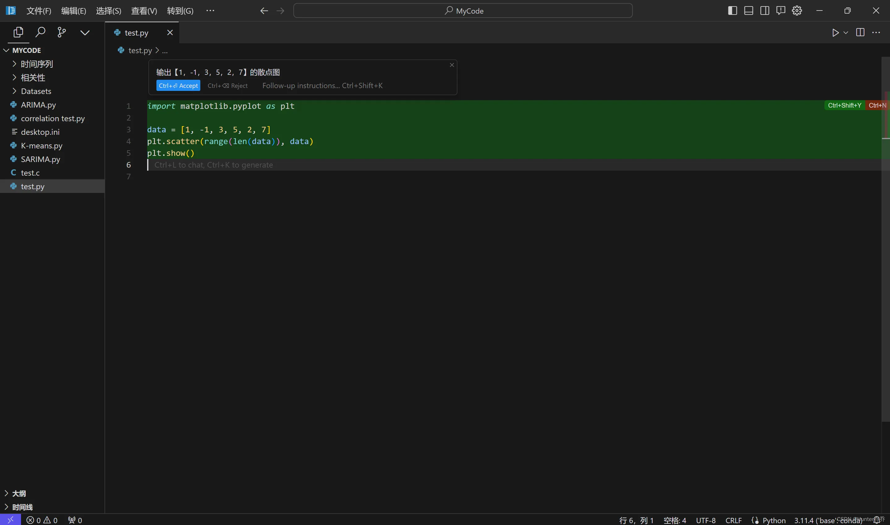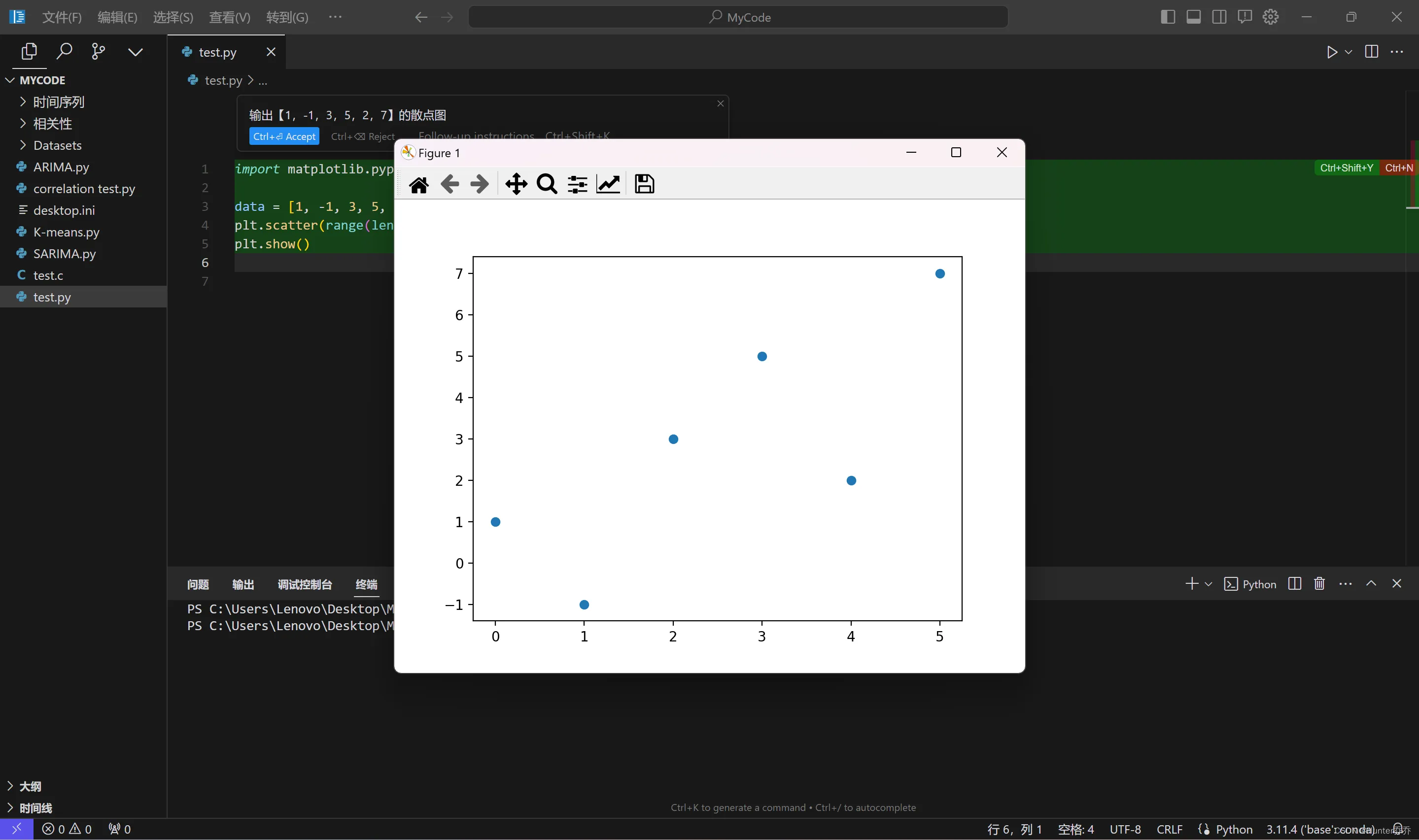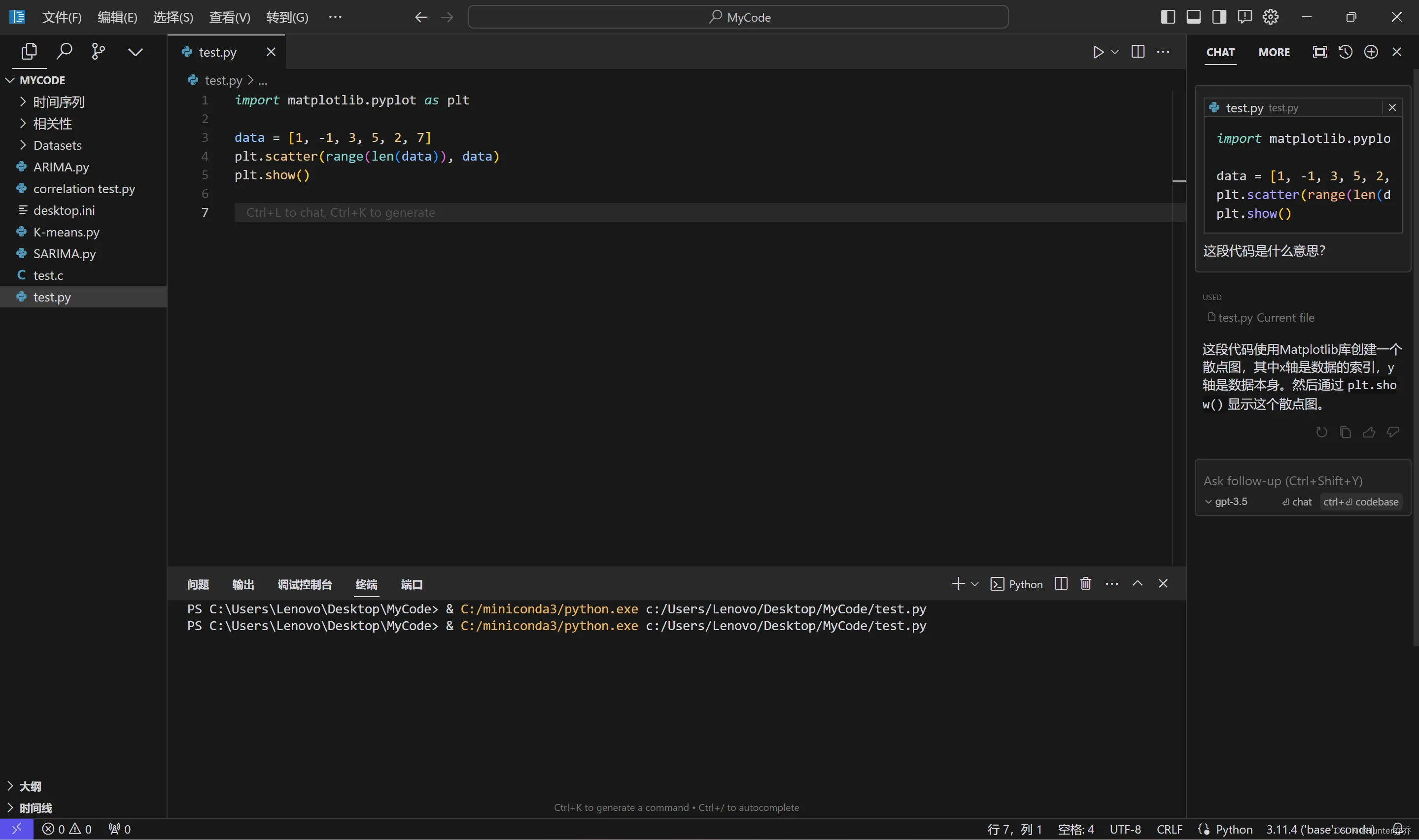 在一些情况下,我们需要导入相关库来满足绘制图表、统计、科学计算等需求。如果你使用的是Conda来管理Python,可以在按Ctrl+`键打开终端,输入: