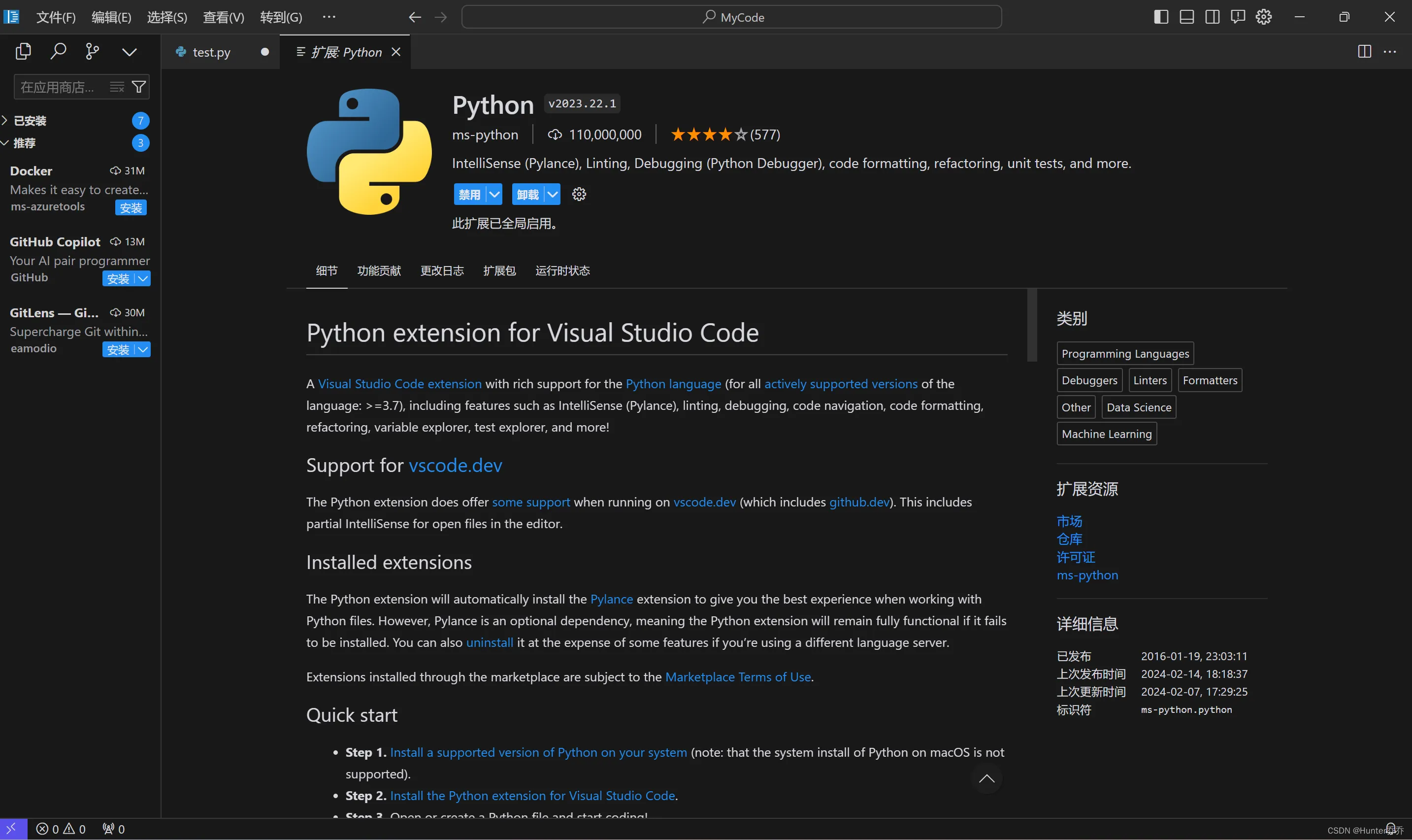 同样点击扩展,在搜索框内输入Python(其他语言选择相应插件),点击安装。